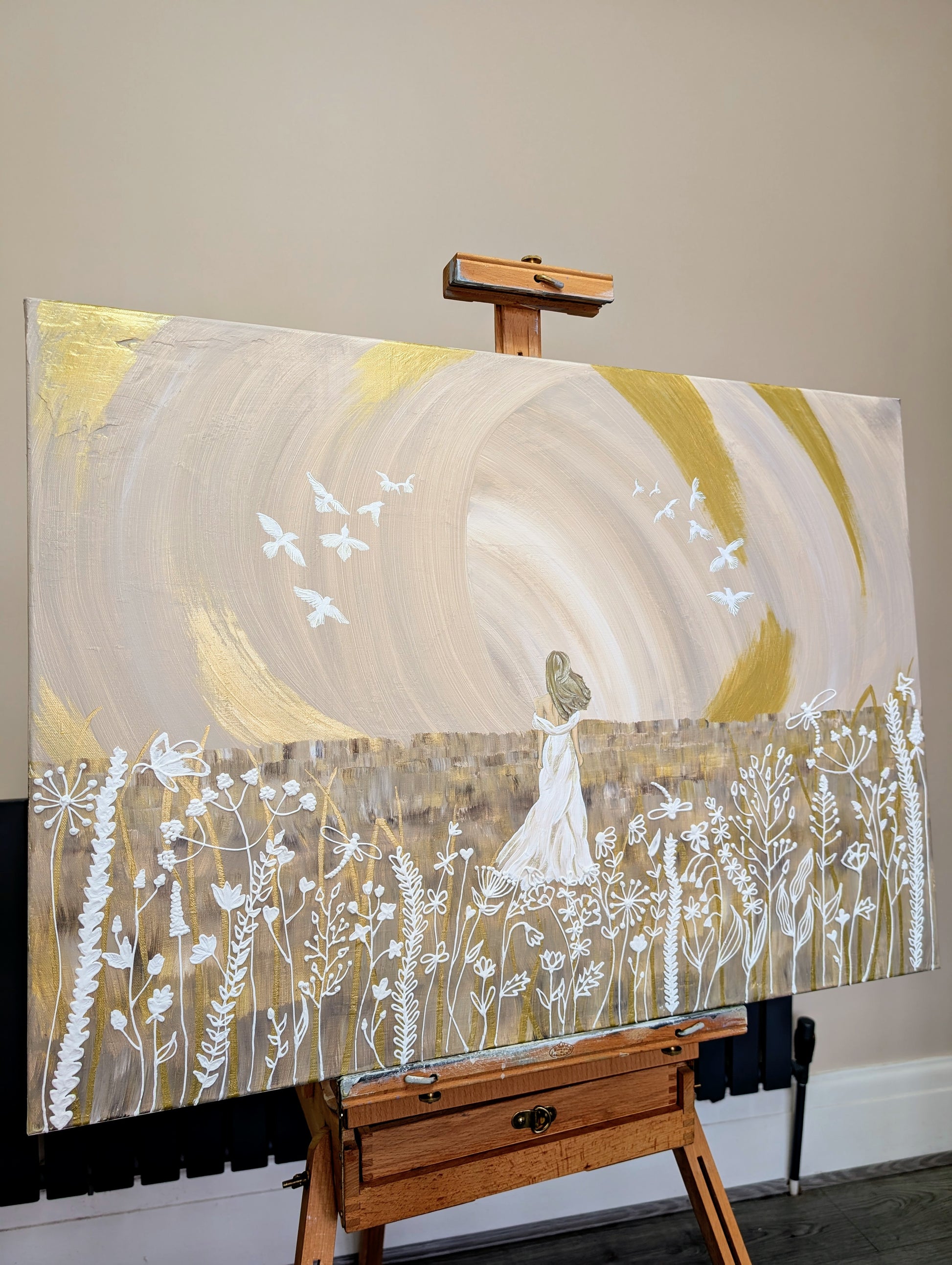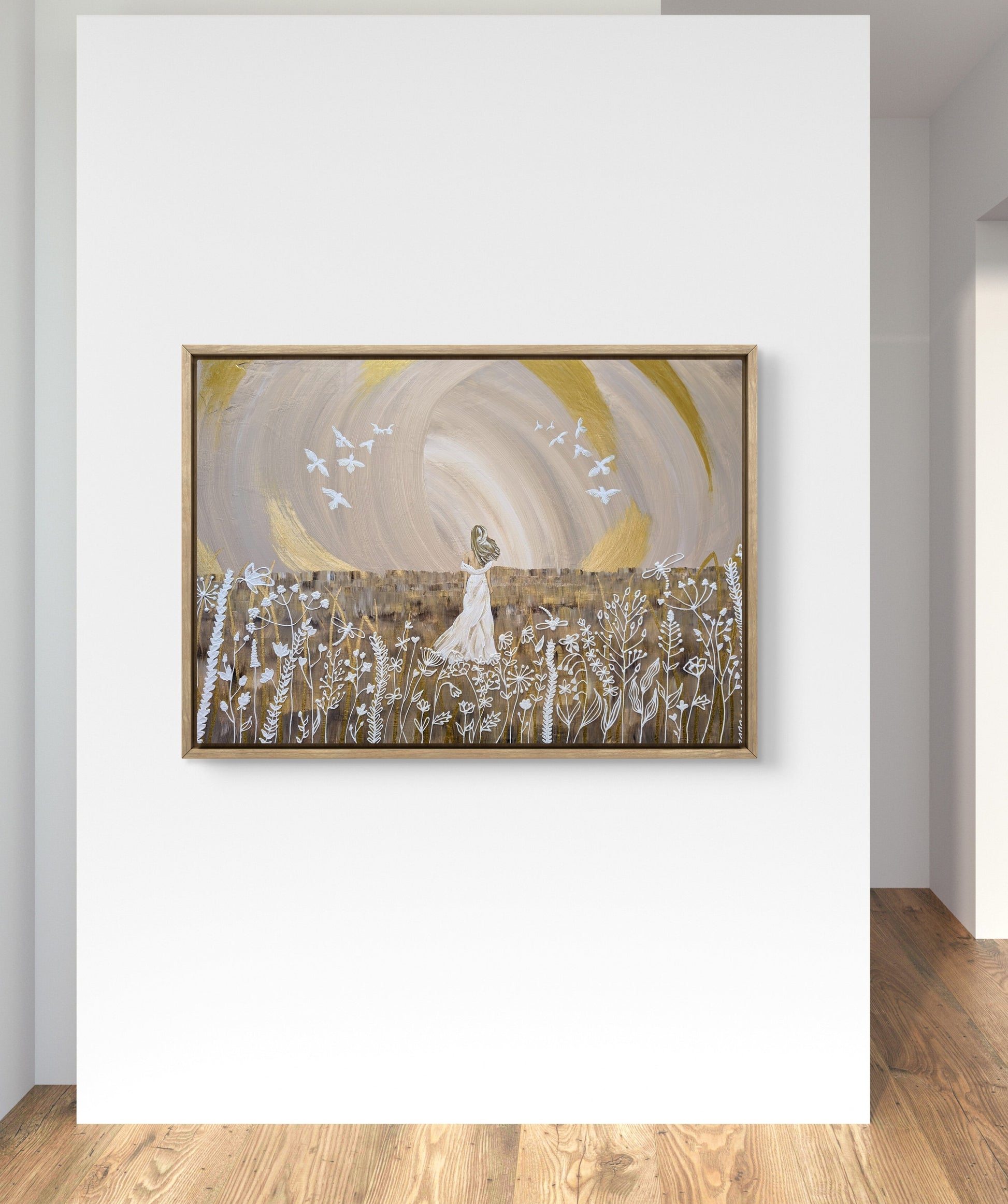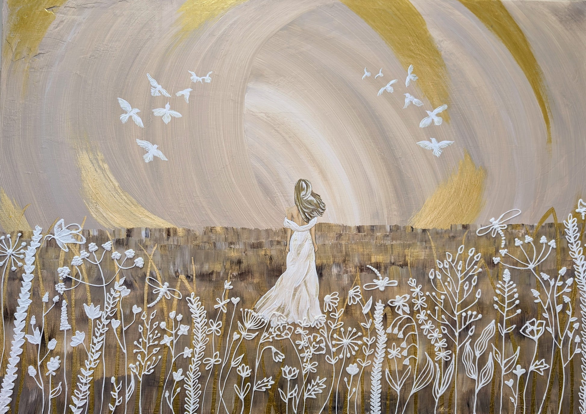 This evocative piece invites the viewer into a dreamlike world where a lone, graceful figure in a flowing white dress stands poised at the edge of a golden-brown meadow. Her dress, like her flowing hair, glimmers subtly with hand-applied gold detailing, catching the light and adding warmth and soul to the composition. Above her, a flock of white birds with gilded accents soars toward a luminous sky — their movement symbolizing freedom, release, and the promise of transformation.