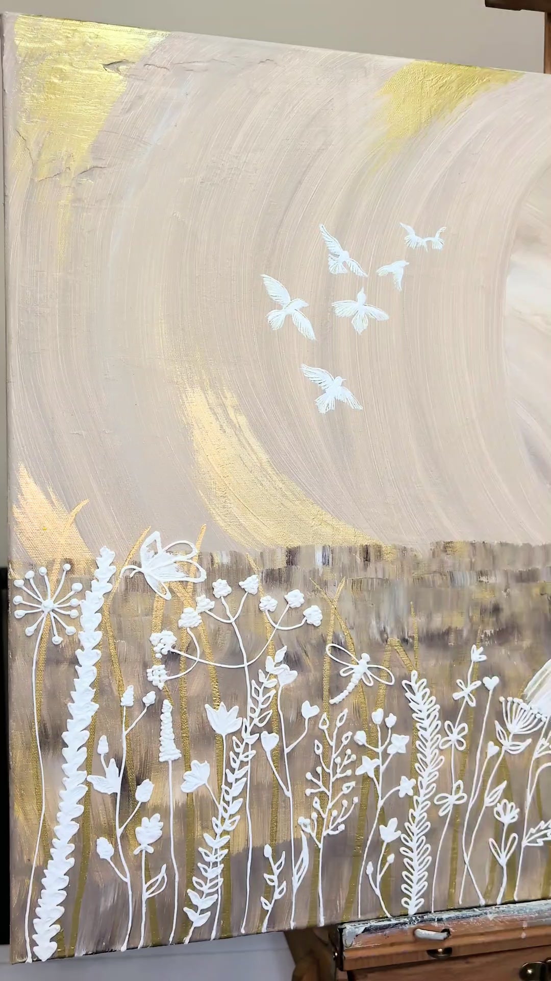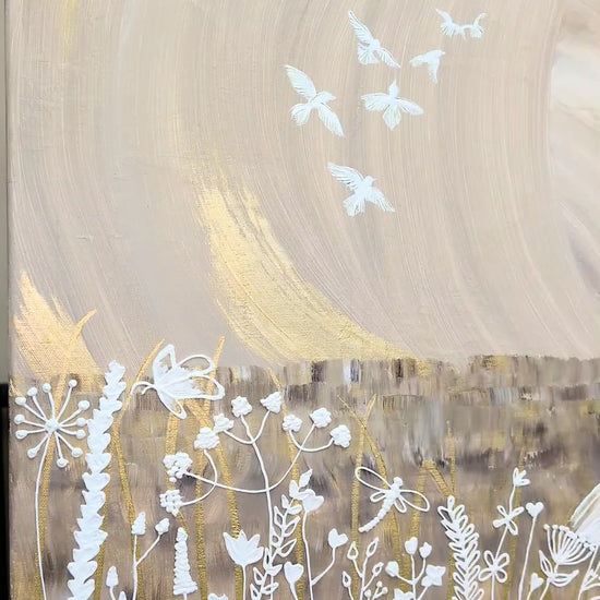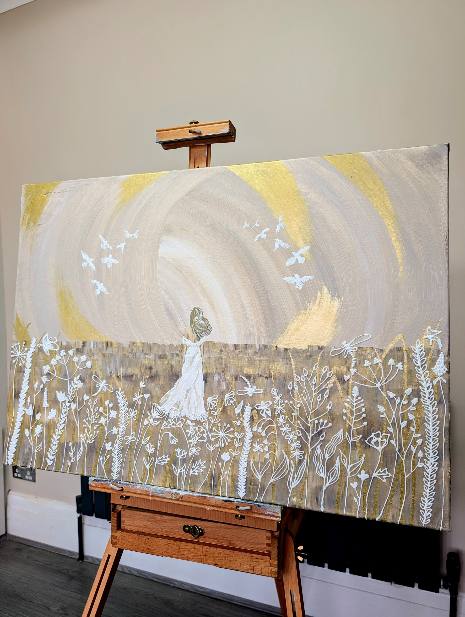 This evocative piece invites the viewer into a dreamlike world where a lone, graceful figure in a flowing white dress stands poised at the edge of a golden-brown meadow. Her dress, like her flowing hair, glimmers subtly with hand-applied gold detailing, catching the light and adding warmth and soul to the composition. Above her, a flock of white birds with gilded accents soars toward a luminous sky — their movement symbolizing freedom, release, and the promise of transformation.